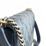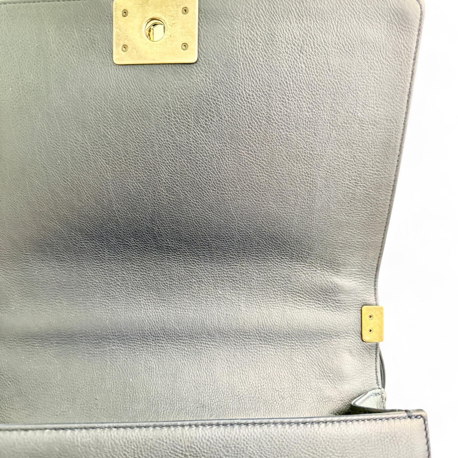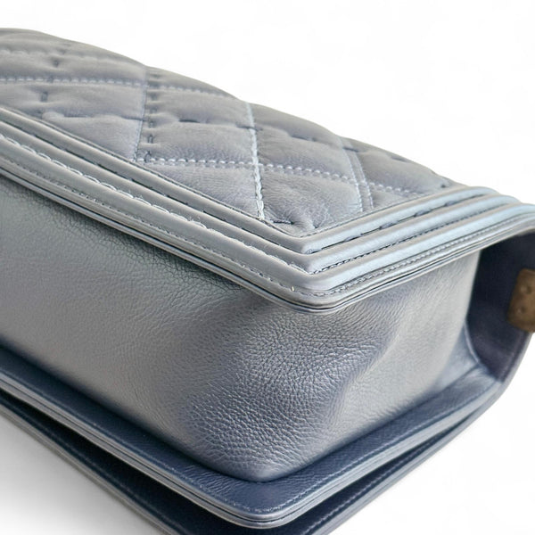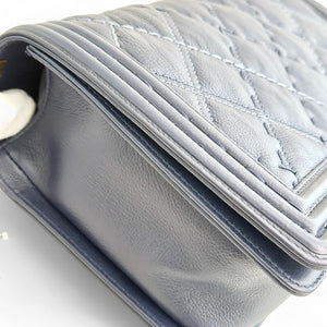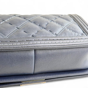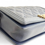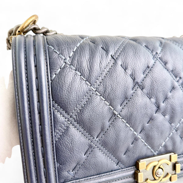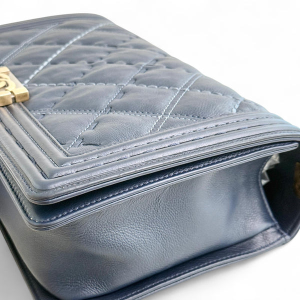 A structured classic with a twist, this Chanel New Medium Boy Bag features unique stitch detailing on luxurious blue calfskin leather. The aged gold-tone hardware adds a vintage flair, making it a statement piece for any Chanel collector. A versatile day-to-night companion with timeless appeal.