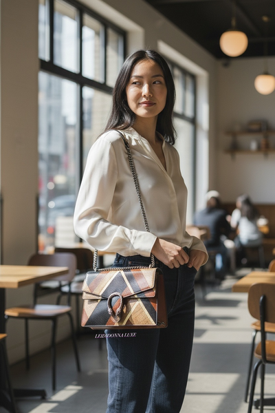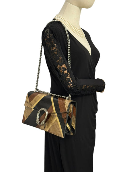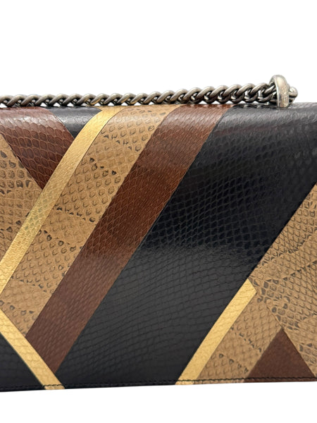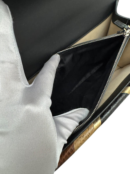 A stunning and highly coveted Gucci Dionysus crafted in Ayers exotic leather with rich natural tones of black, brown, and gold. The signature silver-tone tiger head closure adds an iconic touch, beautifully complementing the textured finish of the bag.