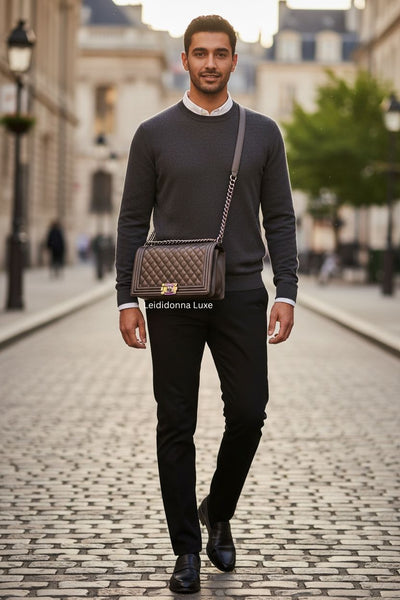 Step into luxury with the Chanel LeBoy New Medium in iridescent bronze, crafted from grained goatskin and adorned with rainbow-plated hardware, offering both style and practicality with dimensions of approximately 7.1” x 11” x 3.5” and versatile strap options, stamped with series number 22066847 showcasing Chanel's dedication to craftsmanship, presented in excellent condition with its authenticity card, box, and dust bag, making it a coveted addition to any fashion lover's collection and a bold statement of timeless elegance and modern sophistication.