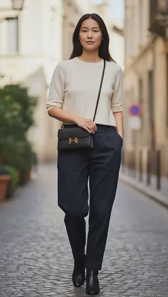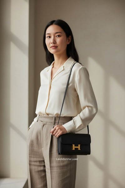 Accented with 24kt rose gold-plated hardware, including the iconic “H” clasp, this Constance exudes quiet luxury. Its slim profile opens to a well-organized interior designed to hold cards, cash, and small essentials, while the removable strap allows it to transition seamlessly from day to evening—worn crossbody, on the shoulder, or carried as a clutch.