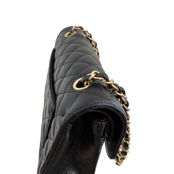 Black quilted handbag with gold hardware on a white background