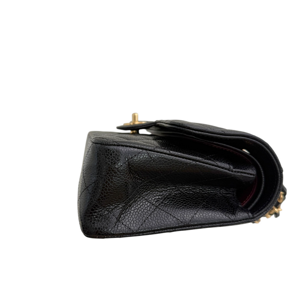 Black quilted handbag with gold accents on a white background