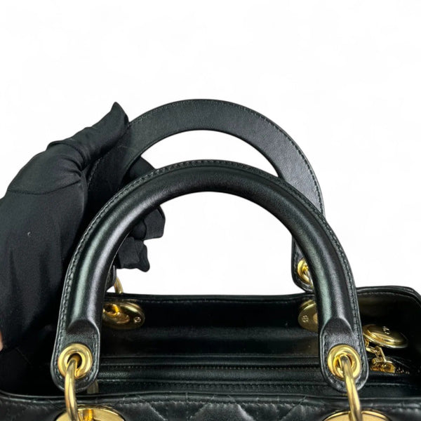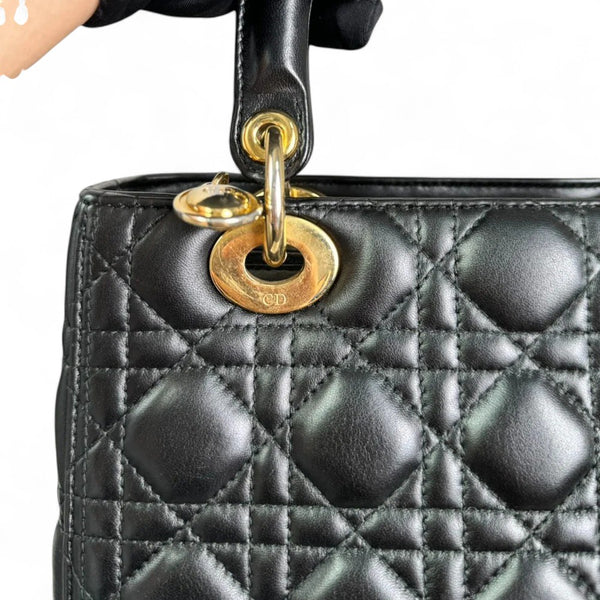 The bag is adorned with gold-tone hardware, including Dior’s signature letter charms, which add a radiant contrast against the classic black leather. Perfectly sized to carry everyday essentials, this medium edition strikes the ideal balance between functionality and elegance.
