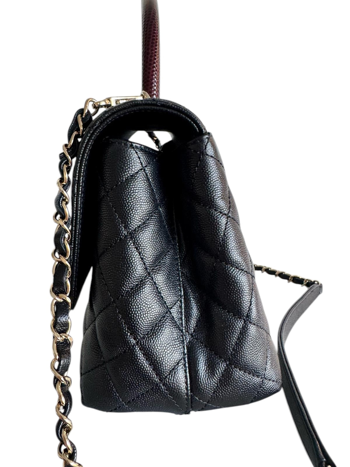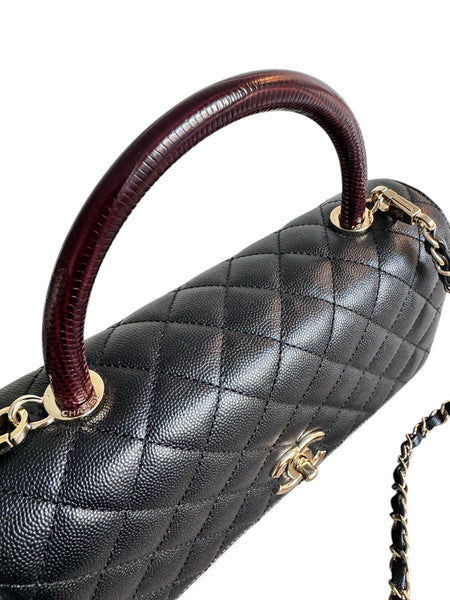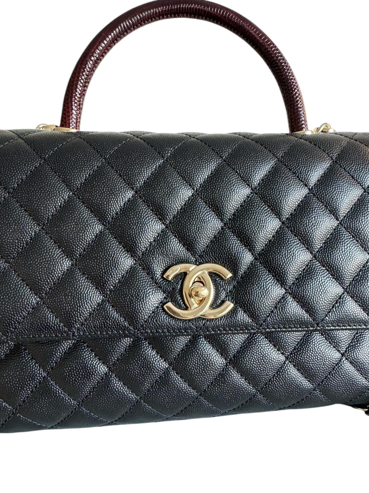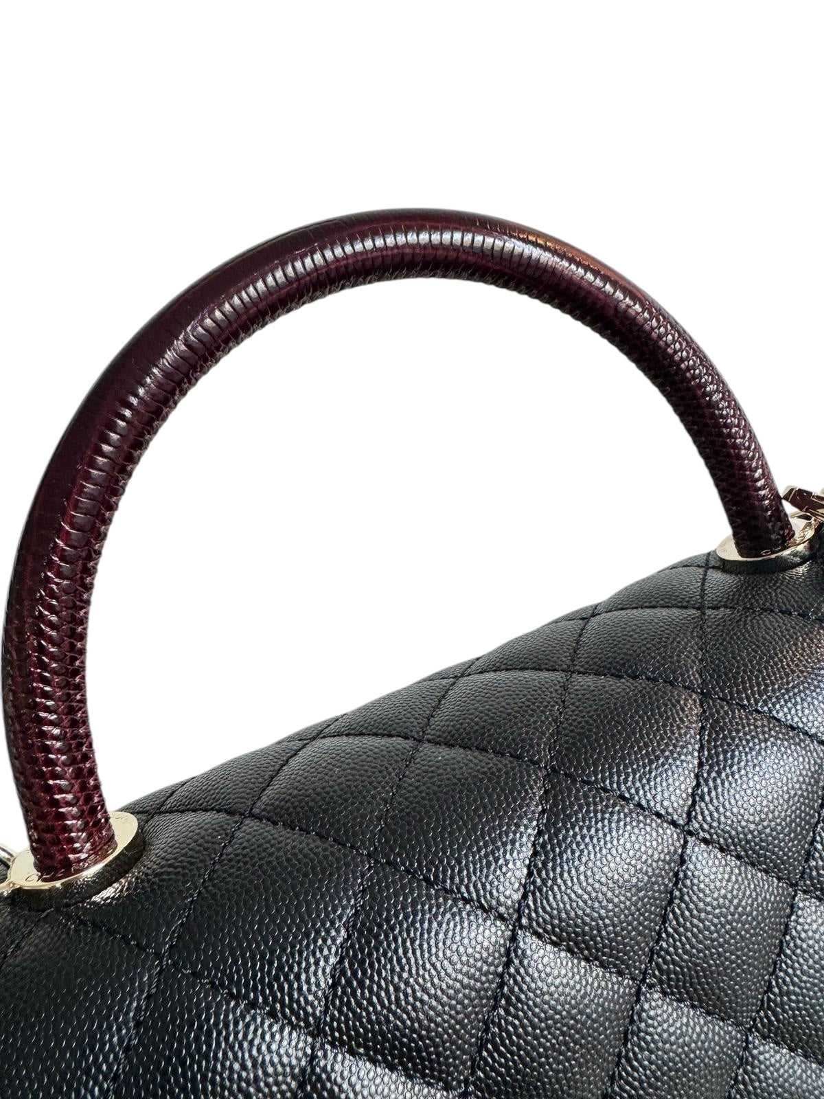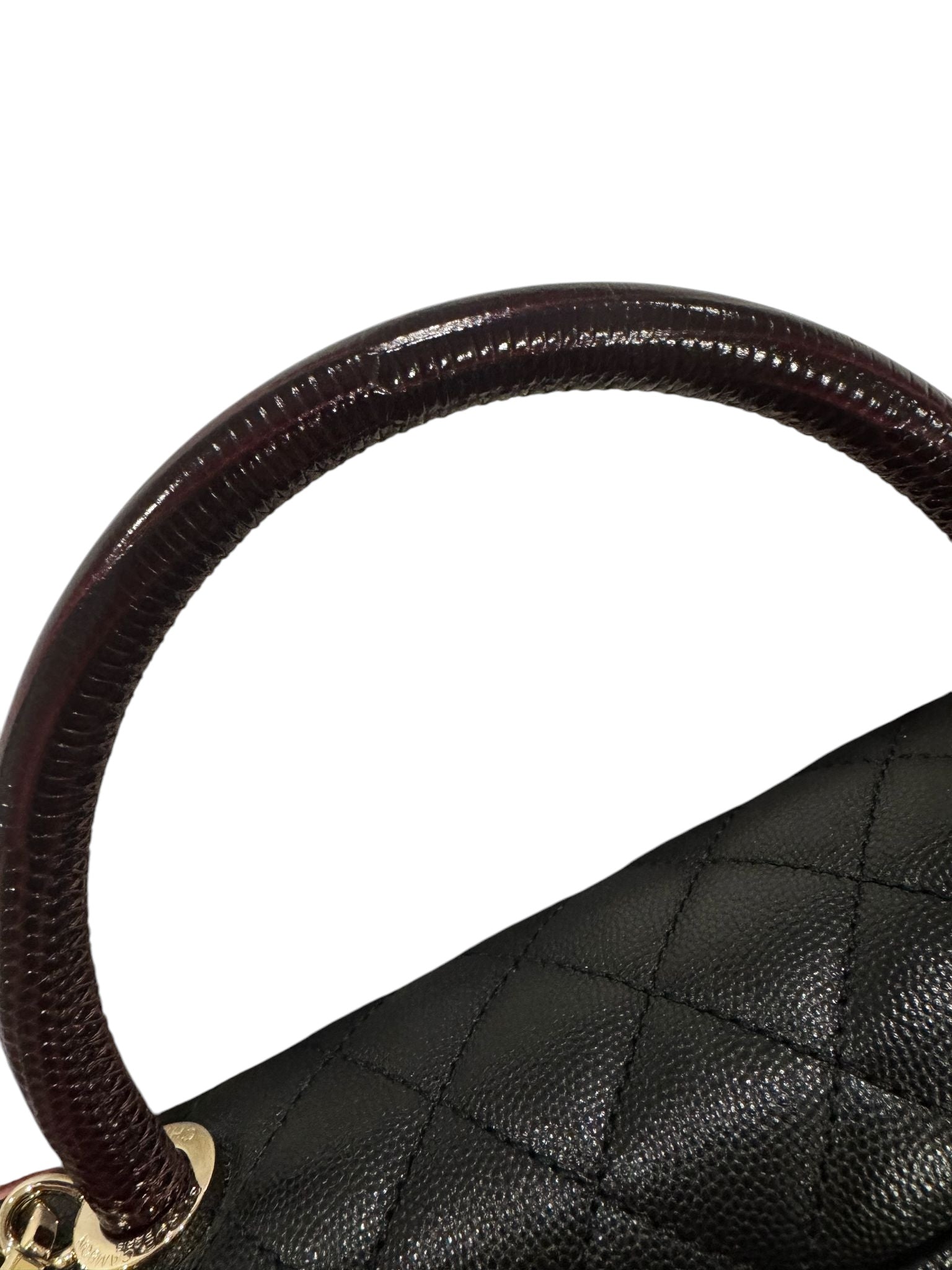 Chanel Coco Handle Medium, Black Caviar Gold-tone Hardware Burgundy Lizard-Embossed Handle