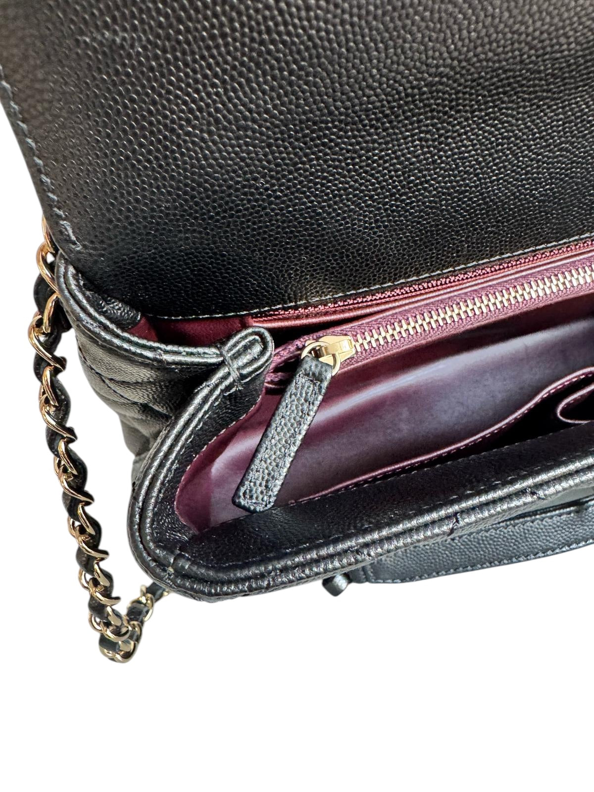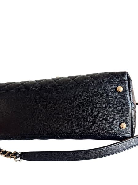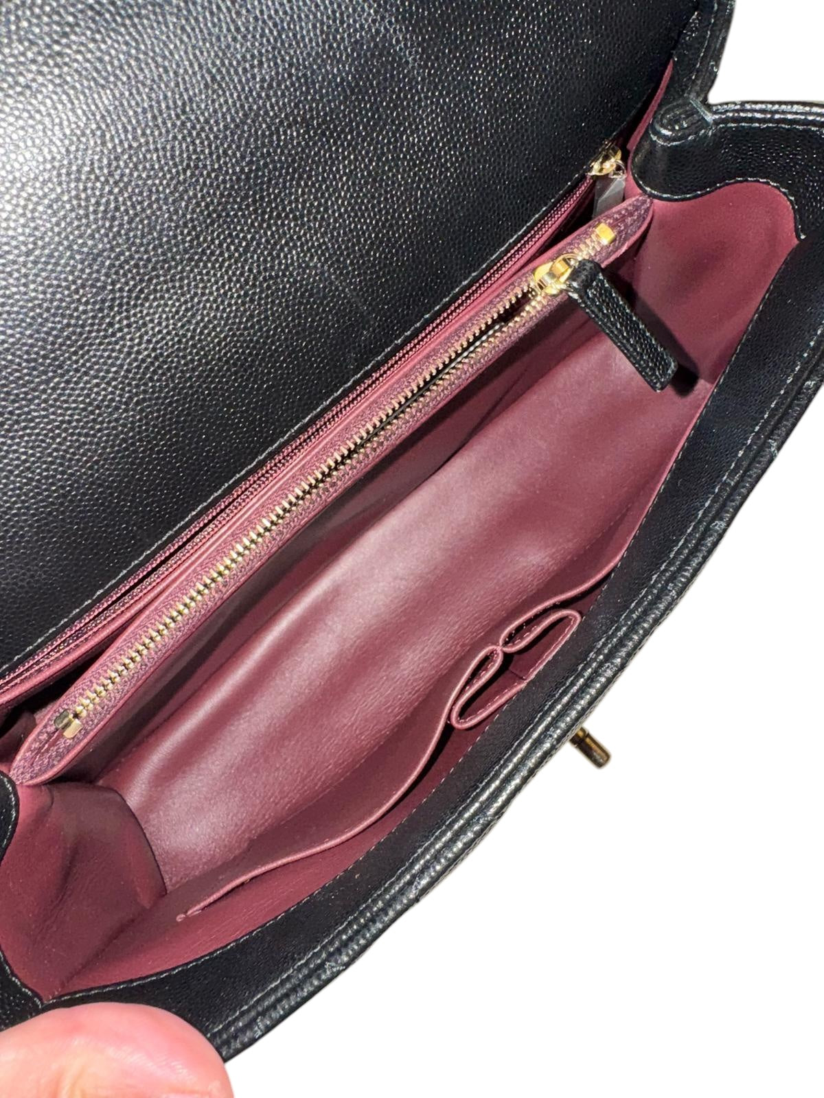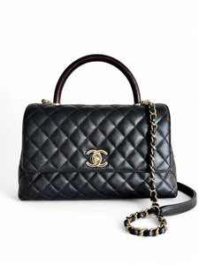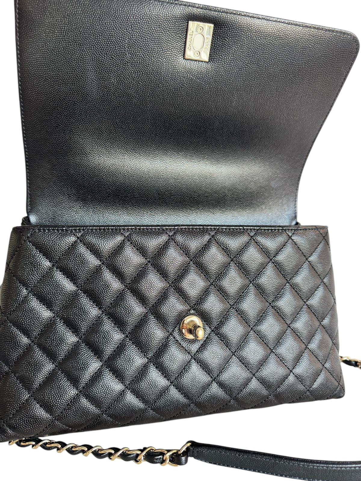 The Chanel Coco Handle Medium is an embodiment of timeless elegance and sophistication. Crafted from luxurious black caviar leather with a distinctive burgundy lizard top handle, this iconic piece brings together durability, texture, and a subtle pop of color. The structured silhouette is beautifully complemented by gold-tone hardware, giving the bag its classic Chanel charm.
