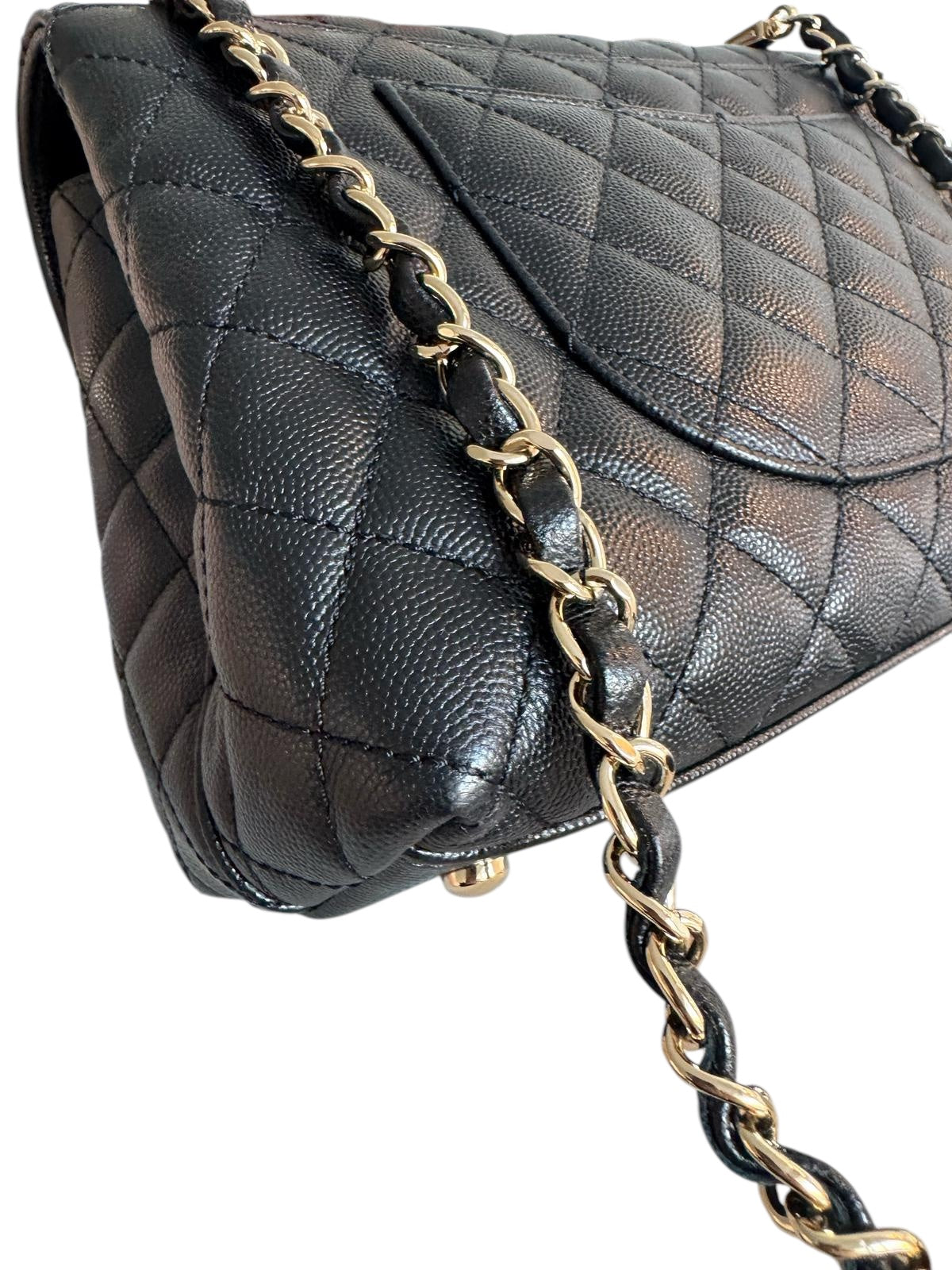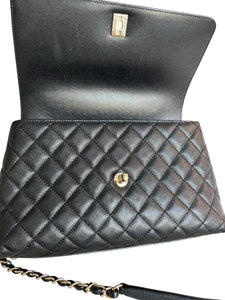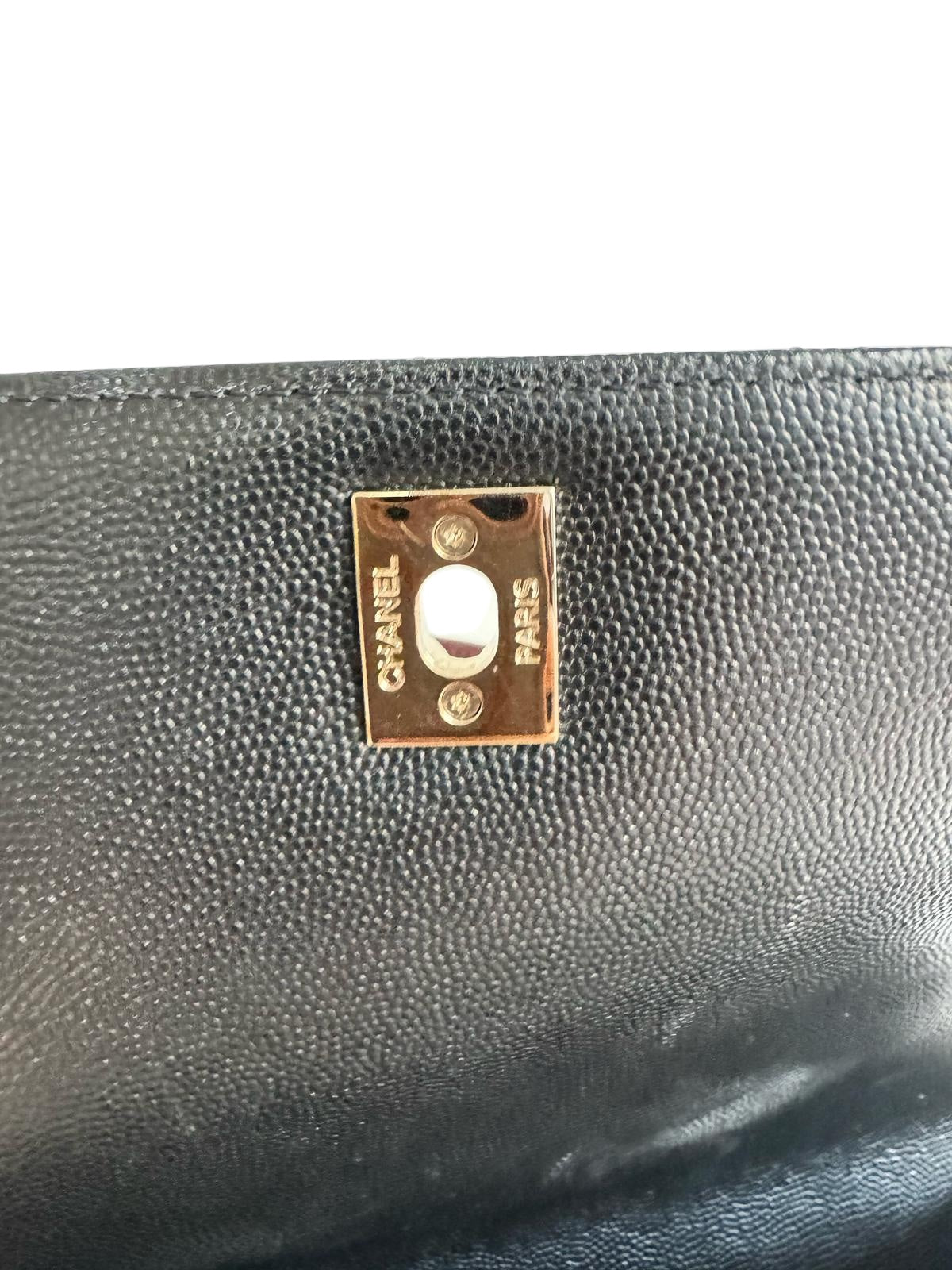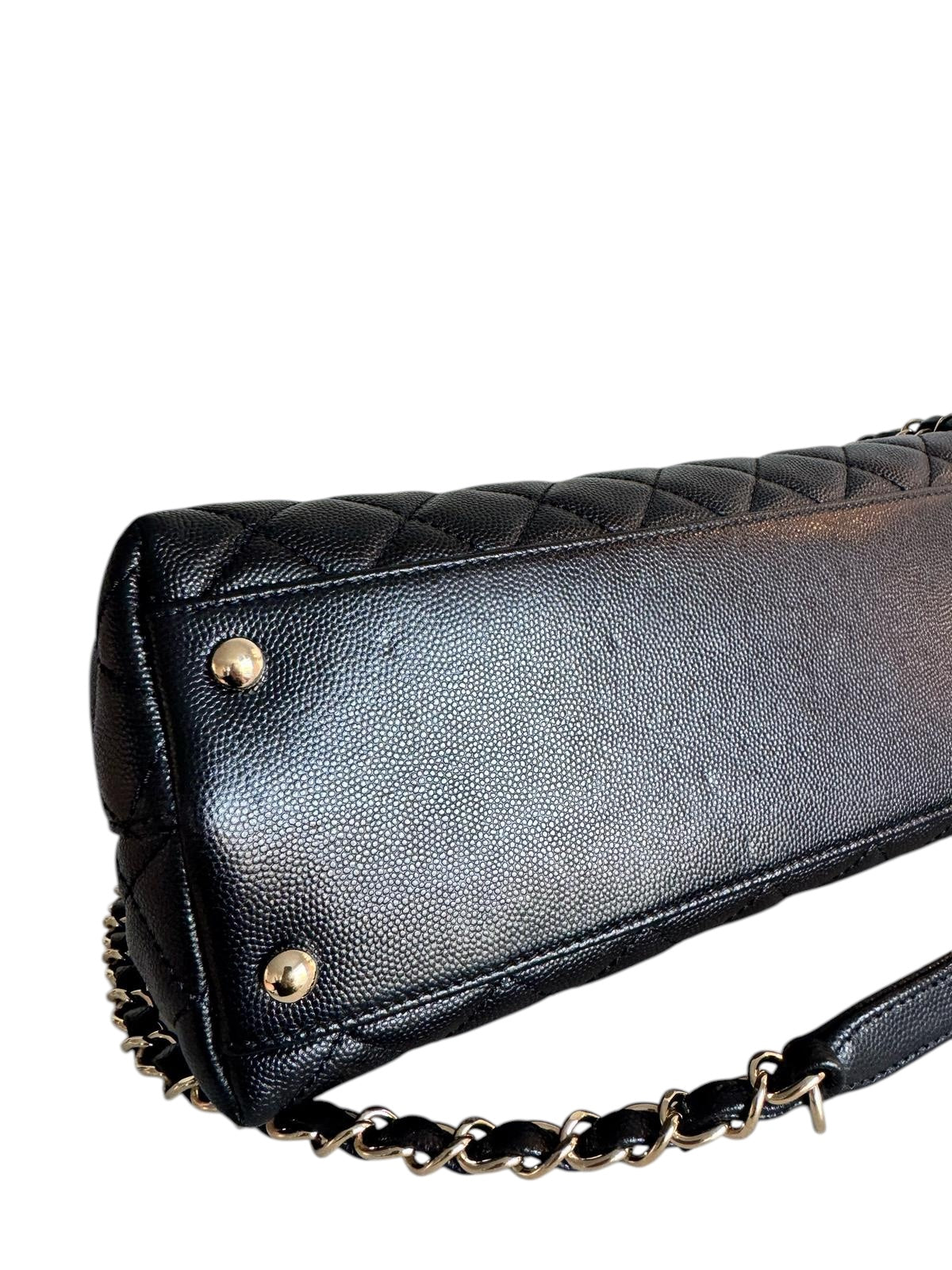 The Chanel Coco Handle Medium is an embodiment of timeless elegance and sophistication. Crafted from luxurious black caviar leather with a distinctive burgundy lizard top handle, this iconic piece brings together durability, texture, and a subtle pop of color. The structured silhouette is beautifully complemented by gold-tone hardware, giving the bag its classic Chanel charm.