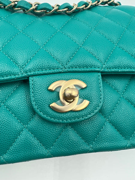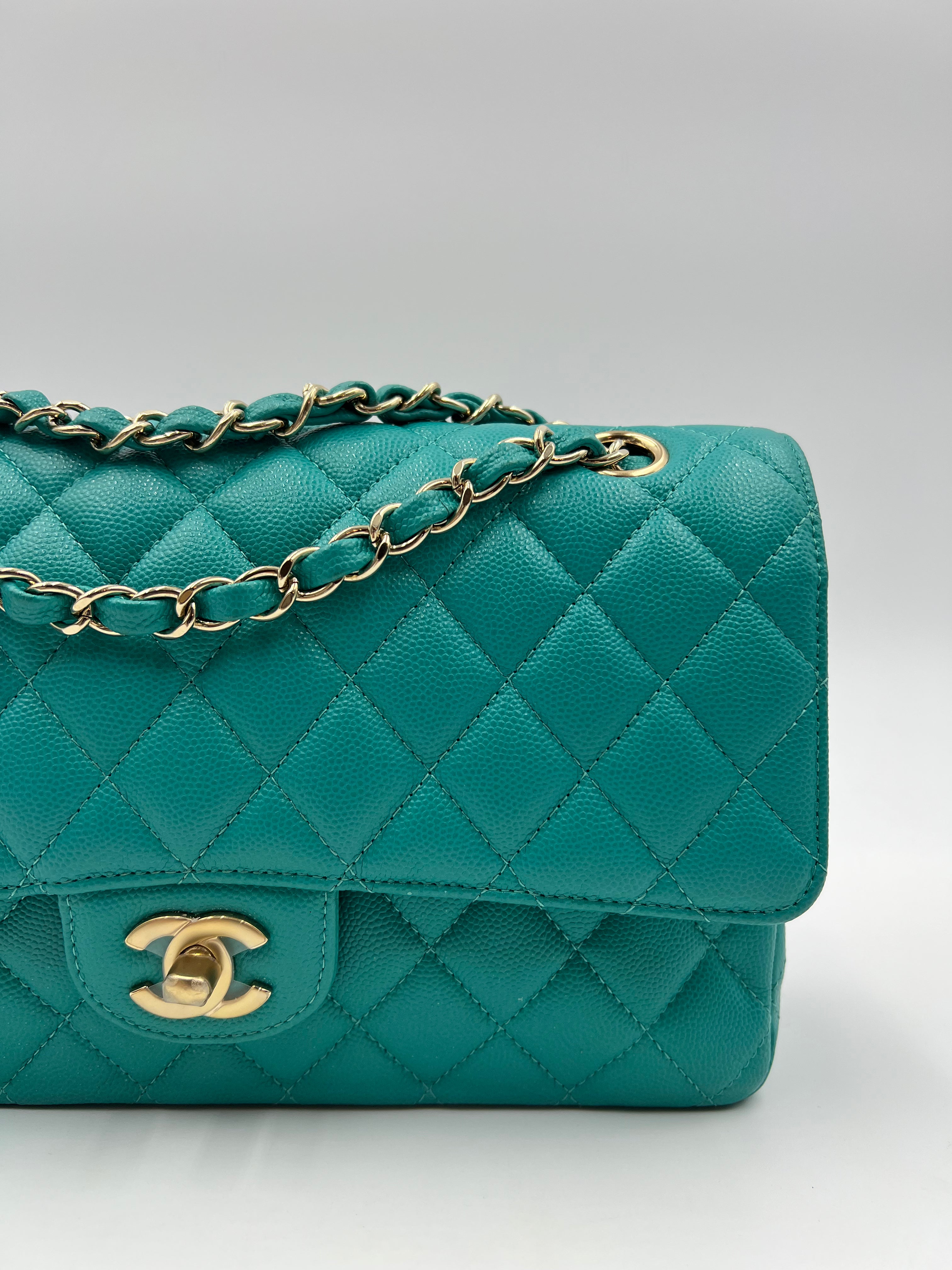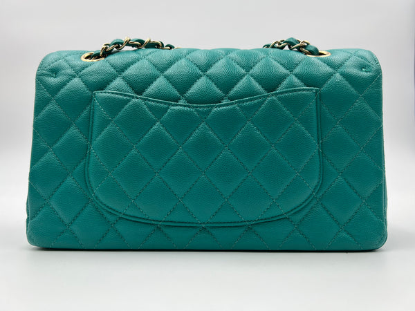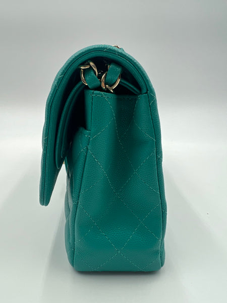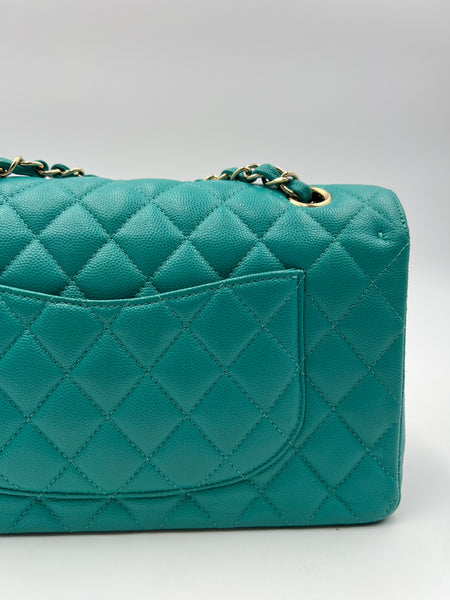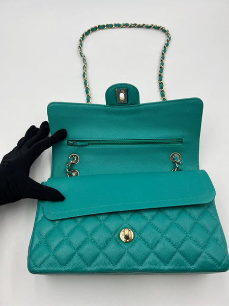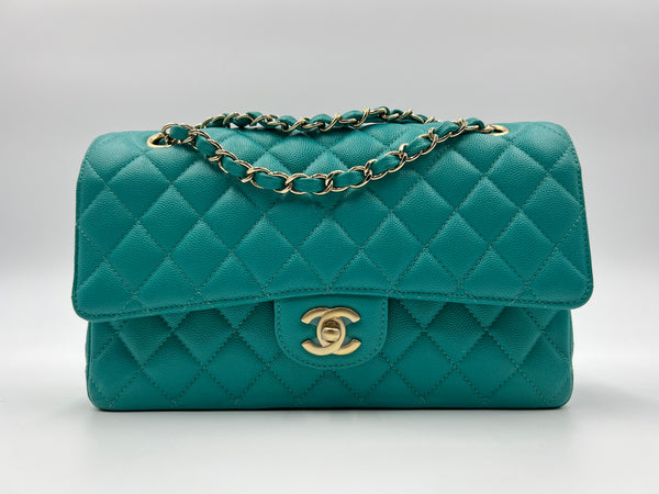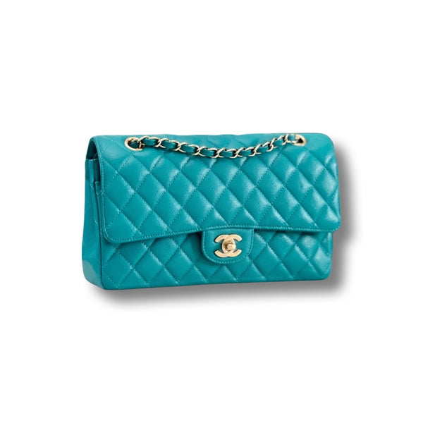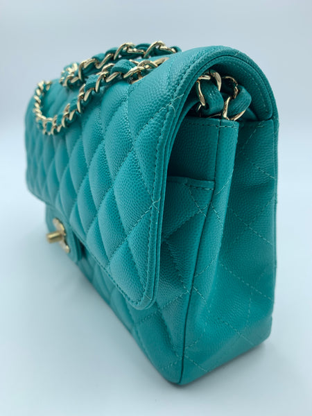 This authentic, preowned CHANEL TIMELESS CLASSIC MEDIUM M/L handbag is a preloved designer masterpiece that embodies high-end luxury. Distinguished by its rare and vibrant 17C Turquoise color, this bag captures the essence of a particular season with its unique hue. Crafted from exquisite caviar/grained leather and adorned with gold-tone hardware, it epitomizes timeless elegance.
