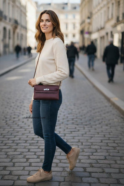 The Hermès Kelly Togo On the Chain Clutch in Bordeaux is a true statement piece, crafted from premium Togo leather known for its soft yet durable texture. This clutch features the iconic Kelly flap closure with Palladium hardware, offering a sleek and timeless design. The rich Bordeaux shade adds a touch of elegance, making it perfect for both day and evening occasions. It comes complete with a detachable shoulder strap, allowing versatile styling as a clutch or crossbody.
