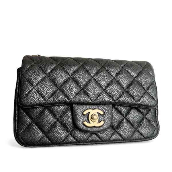 A truly coveted classic, this Chanel Mini Rectangular Flap in Black Caviar Leather with Gold Hardware is one of the most in-demand combinations Chanel has ever released. The durable caviar leather, iconic mini silhouette, and rich gold-tone hardware make it the perfect day-to-night luxury piece.