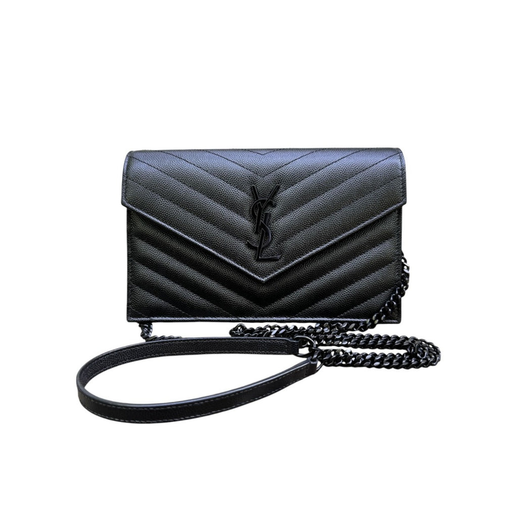 Saint Laurent YSL Wallet On Chain Black Grain De Poudre Matelassé Chevron Black Hardware